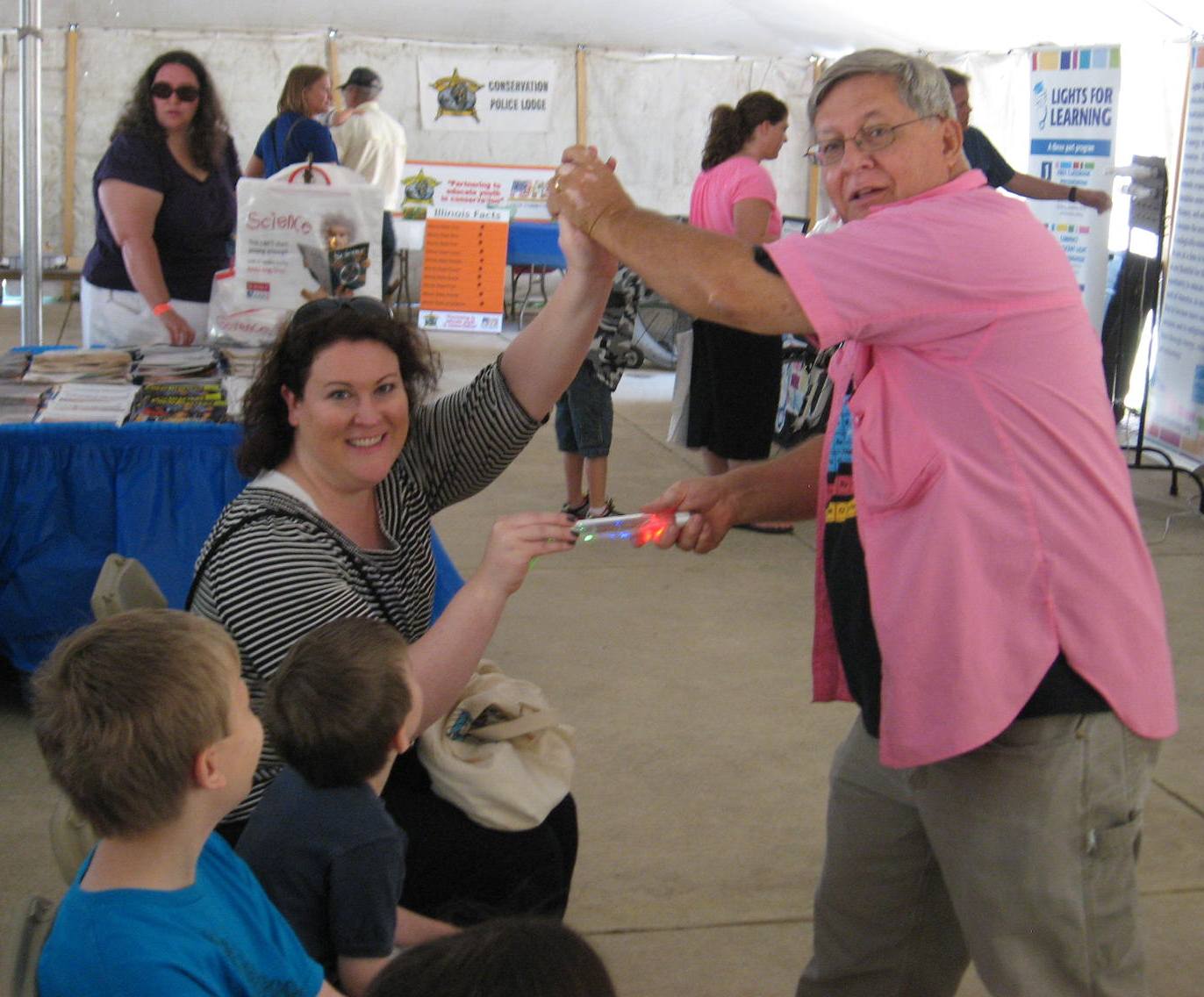 The Energy Stick is a 7.5" long by 1.25" diameter hollow glass tube that lights up and chirps when a conductive path is provided between the two ends. The amount of current needed to turn on the tube is so small that the current flowing through a human body or a chain of people holding hands is enough to turn on the tube. A great demonstration of electrical conductivity. The Energy Stick can be purchased from Steve Spangler Science: |
